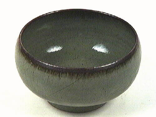 Rund skål på fot. Celadon-grön glasyr, smala diagonala linjer över manteln. Brun rand runt kanten. tillverkad sommaren 1985 på Designhuset i ett experiment med en vedeldad kinesisk brännugn "Ching-tê-chên". Där man får en mycket stark värme som gör att man kan få fram speciella glasyrer. Har Nummer 74 i kollektionen.