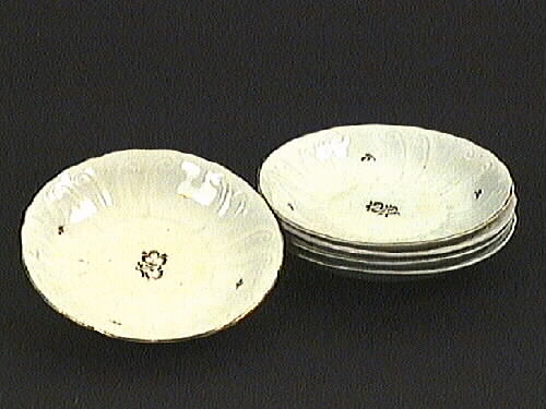 Tefat, % st udda av vitt fältspatporslin. Relief mönster på brättet med voluter. I mitten en treuddad blomma med blad i guldfärg. Fyra små guldblad på brättet. Gulddekoren sliten. Har brukats tillsammans med 5M16-9867,9868,9871,9872,10141,10142.