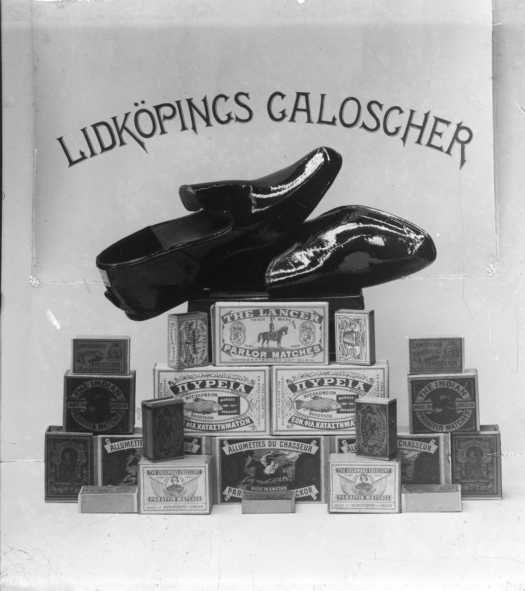 Reklam för Lidköpings galoscher. Ett par galoscher ligger på uppställda tändsticksaskar.