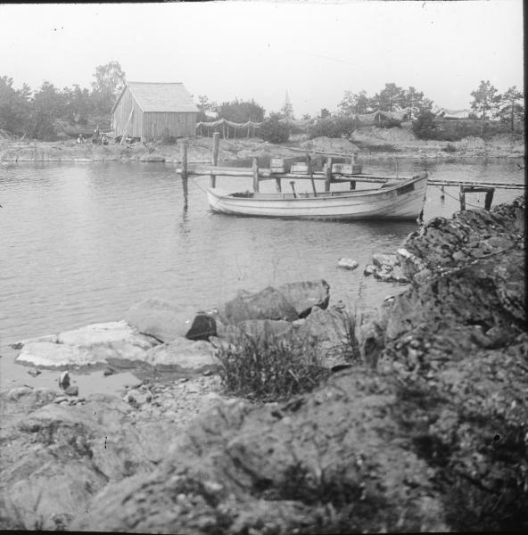 Båthamn vid Jäleviken, Kålland, med båt och fiskenät på tork.