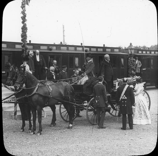Kung Oscar II ankomst med tåg till Råbäck för vidare färd med hästtransport.