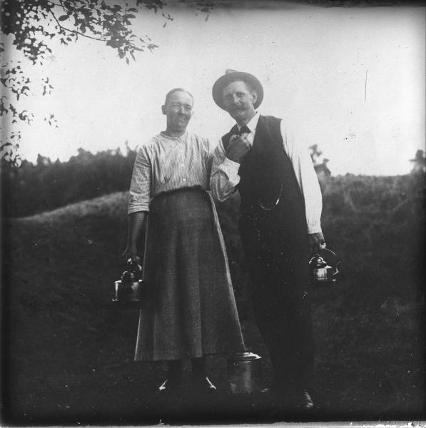 Par med kaffekittlar och vattenhink. Troligen Axel Kihlander och Westerståhl?
