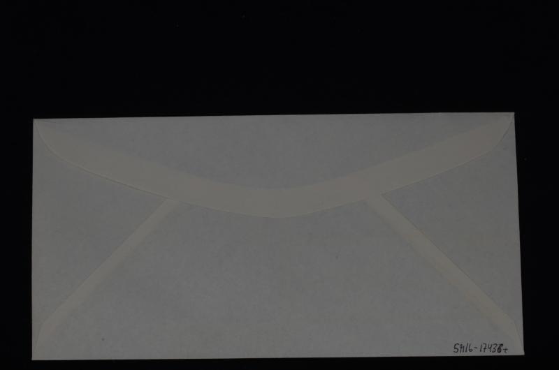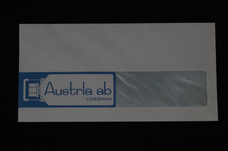 Kuvert / fönsterkuvert av tunt papper. Framsidan har en stiliserad plastflaska och text " Austria ab Lidköping". Bakgrundsfärgen är blå, kontrastfärg vitt. Ingen annan text på kuvertet.