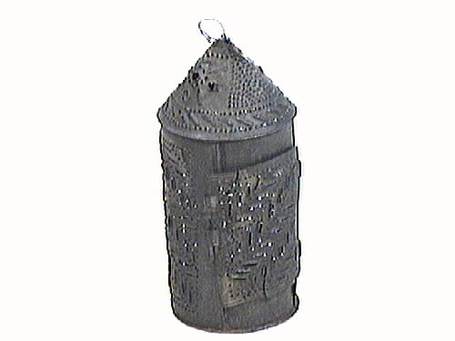 Handlykta i form av en cylinder med konisk överdel. Överst en ringformig ögla av järntråd. Dörr låsbar med sprintlås. Gångjärn av järntråd. Dörren perforerad med små hål. Inuti, mitt på botten, en ljushållare med slits som gjorde det möjligt att sätta fast ljus av olika tjocklek.