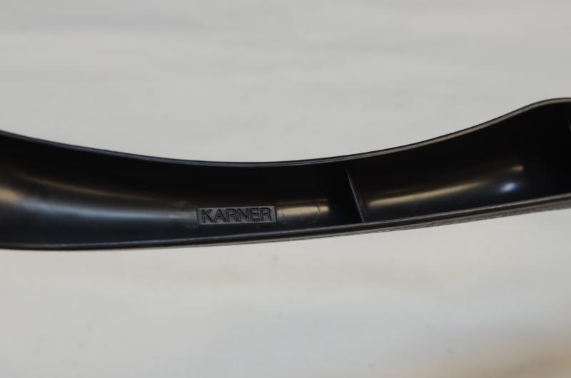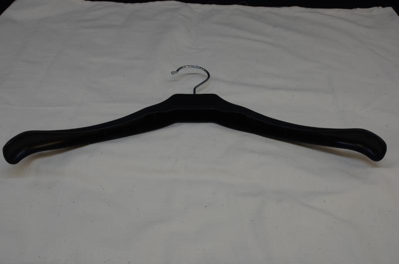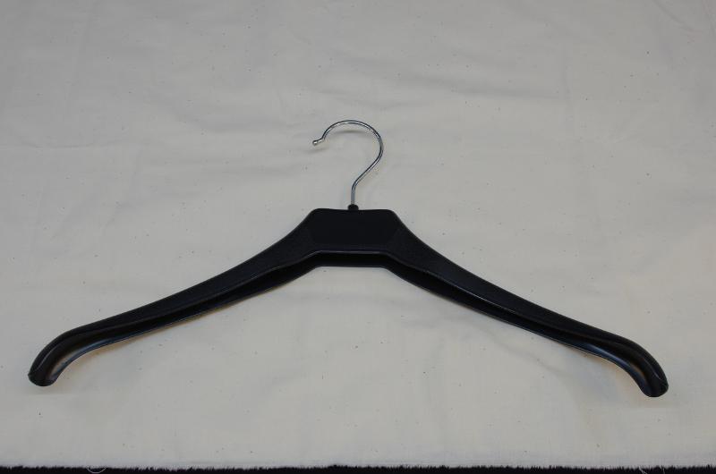 Klädhängare för herrkläder, kavaj och byxor, tillverkad av svart polystyren. Hängaren är lätt böjd in på framsidan. Hängarens djup varierar. Text på undersidan: KARNER, MOD. 104.