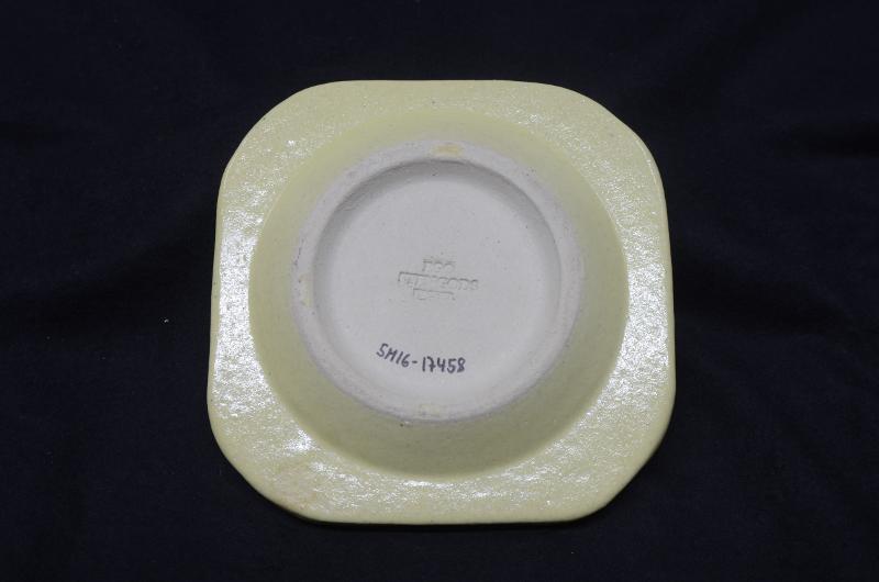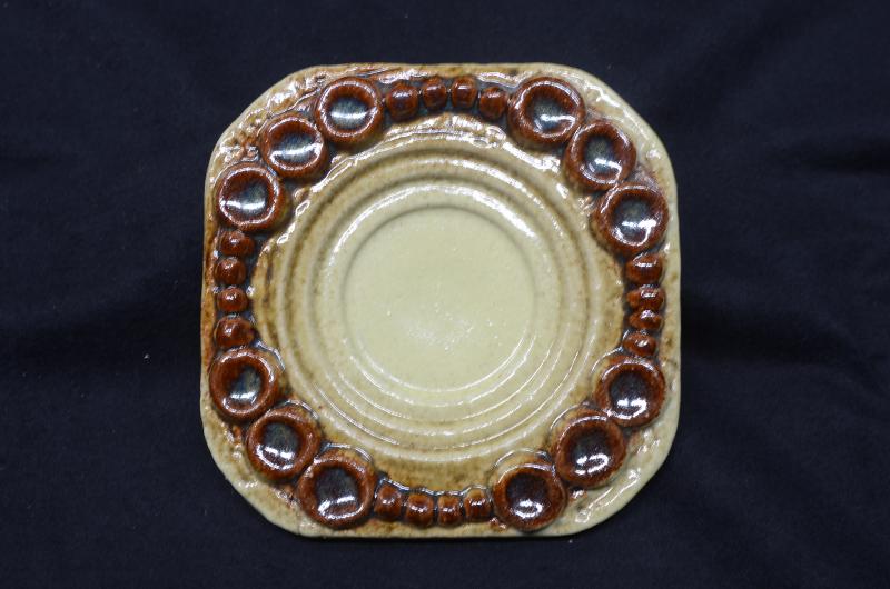 Askfat, gulbrunt, ljusast i mitten, omgiven av en brun krans av upphöjda ringar. Relief i botten: EGO STENGODS FISCHER