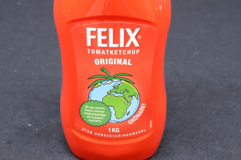 En röd flaska i formblåst PET-plast. ca 1 liter. På framsidanfinns en röd etikett med vit text: FELIX TOMATKETCHUP ORIGINAL, 1 KG, UTAN KONSERVERINGSMEDEL. I mitten ett jordklot med en grön rest från en tomat på toppen, och ett grönt fält med vit text: Vår nya smarta flaska minskar koldioxidutsläpp vid transport med 90%. Bredvid finns texten: GRÖNARE. Här står också i liten stil: 866572x