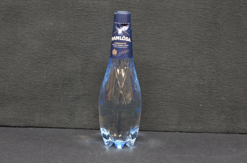 Flaska tillverkad av PET-plast, ofärgad, 80 cl, för engångsbruk, fylld med Ramlösa mineralvatten. Flaskan har en en blå kork och en blå pappersetikett runt halsen i anslutning till korken. På etiketten står det: RAMLÖSA, CARBONATED NATURAL MINERAL WATER, Ramlösa Sweden since 1707. På ovansidan av korken står; Ramlösa Sweden since 1707, samt en namnteckning. På etiketten finns också en innehållsförteckning, kontaktuppgifter, streckkod, uppgift om volym och pant, en namnteckning och märke som visar att de är kunglig hovleverantör. Här är också bäst-före-datum tryckt: 01.07.2015.G. Flaskan har ett rentagulärt mönster i relief, som går snett från botten till toppen. Öppningens diameter är 23 mm.