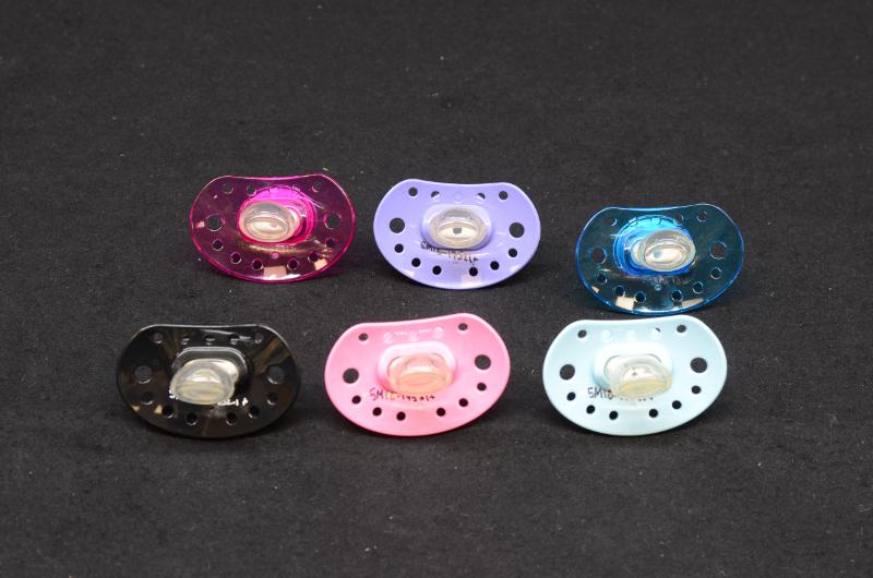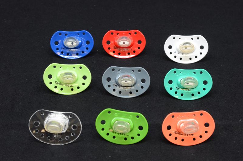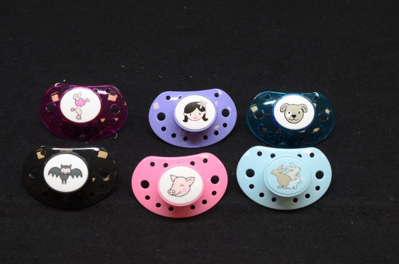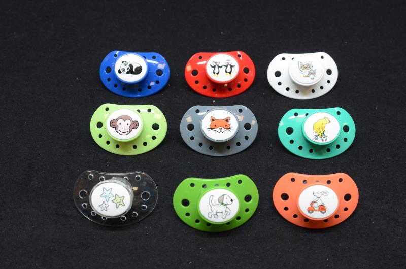Napp av modellen Esska Classic, tillverkade av polyester (coPET) och silikon/latex, av AB Robert Schmitz, Skogvaktarevägen 5, Stubbehagens industriområde, Lidköping.De 15 napparna har 15 olika motiv och färger. Information från produktkatalog ESSKA of Sweden Product catalog 2014/2015. katalogen finns i arkivet på OCM 384 Syntetvaruindustri samt som eget föremål, inv nr: 017539. Utställda i monter på utställningen Från porslin till plast - Lidköping under ett omvälvande århundrade, 2015-04-16 - 2016-01-17.
