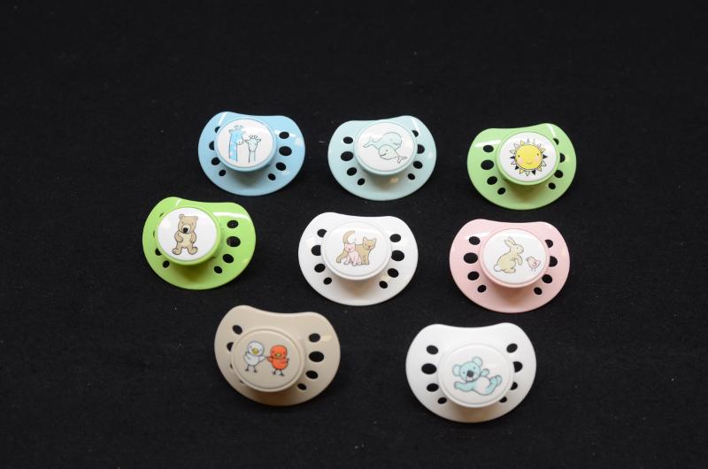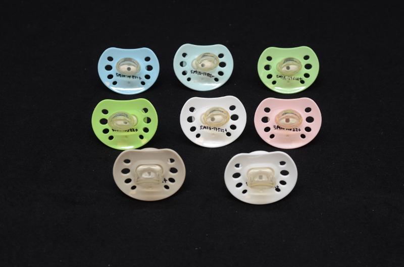 - Napp av modellen Esska Classic Miini, tillverkade av polyester (coPET) och silikon/latex, av AB Robert Schmitz, Skogvaktarevägen 5, Stubbehagens industriområde, Lidköping. De 15 napparna har 8 olika motiv och är gjorda i 7 olika färger. Information från produktkatalog ESSKA of Sweden Product catalog 2014/2015. katalogen finns i arkivet på OCM 384 Syntetvaruindustri samt som eget föremål, inv nr: 017539. Utställda i monter på utställningen Från porslin till plast - Lidköping under ett omvälvande århundrade, 2015-04-16 - 2016-01-17.