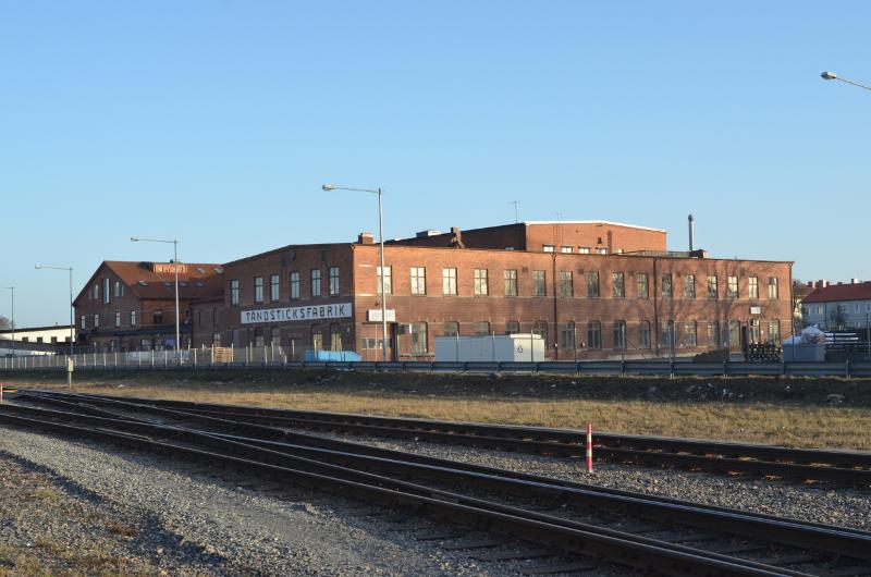 Tändsticksfabriken Sirius 1905-1963. Bilden tagen från Sockerbruksgatan. Kinnekullebanan i förgrunden.