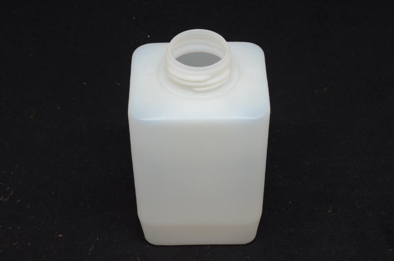 - En formblåst fyrkantig plastfalska av vit halvt transaprent plast med öppning i mitten på ovansidan. Tillverkad av polyeten, troligen high density(PE-HD). Flaskans öppning är 38 mm. Volymen är ca 1 liter. Kork saknas. I botten står i relief tillverkarens namn PLM, samt sffran 814096.