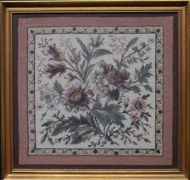 Broderi i olika färger med blom- och växtmotiv. På baksidan av tavla står med blyerts: Detta broderi utfördes på 1940-talet av fröken Vera Sandström som vid denna tid var husföreståndarinna hos bagarmästare Georg Westerståhl i Lidköping. Tavlan inglasad och ramas med ram i guldfärg. Kerstin Hallin gav dentill museet 2019-11-06.