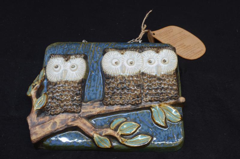 Väggtavla i stengods föreställande tre ugglor som sitter på en trädgren. Botten blå och motivet i färgerna brunt, vitt och turkos. På baksidan står i relief: EGO STENGODS. På baksidan finns också en prislapp från emmaus Björkå påklistrad med siffran 125 skriven för hand med kulspetspenna. Givaren har köpt denna på en av Emmaus second hand-butiker i Göteborg 2018. Priset var alltså 125 kr.
