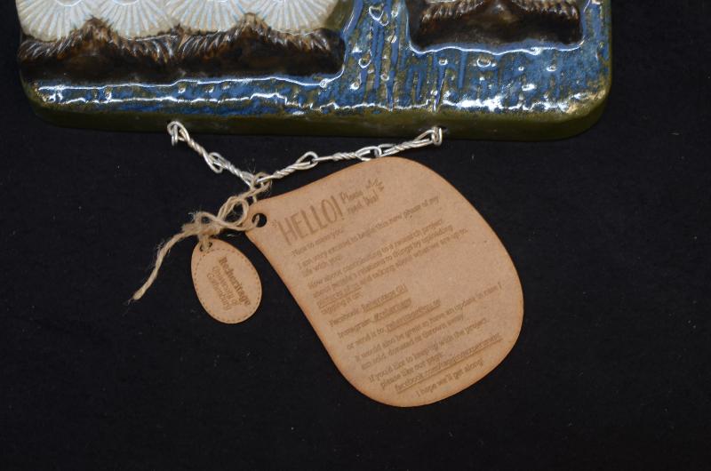 Fastknuten i kedjan med ett snöre finns två små lappar i något korkmaterial. På den lilla avlångt rundade lappem står det: Re:heritage University of Gothenburg. På den större rundade lappen står det: HELLO! Please read this! Nice to meet you! I am very excited to begin this new phase of my life with you! How about contributing to a research project about people's relations to things by upploading pictures of us and talking about what we are up to, tagging it on: Facebook: reheritage GU. Instagram: #reheritage. or send it to: reheritage@gu.se. It would also be great to have an update in case I am sold, donated or thrown away. If you'd like to keep up with the project, please like our page: facebook.com/taggingexperiment. I hope we'll get along!