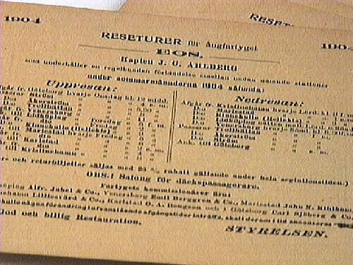 Text: "RESETURER FÖR ÅNGFARTYGET EOS, KAPTEN J. G. AHLBERG SOM UNDERHÅLLER EN REGELBUNDEN FÖRBINDELSE EMELLAN NEDAN NÄMNDA STATIONER UNDER SOMMARMÅNADERNA 1904 SÅLUNDA.....