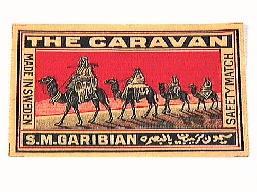 Bilden föreställer en kamelkaravan i svart och gult, med grå, svart och röd mark, och röd bakgrund. Runt om bilden en bred ram med text. Längst upp och längst ned gul text på svart bakgrund: "THE CARAVAN, S.M. GARIBIAN". På kortsidorna svart text på gul bakgrund: "MADE IN SWEDEN SAFETY MATCH".