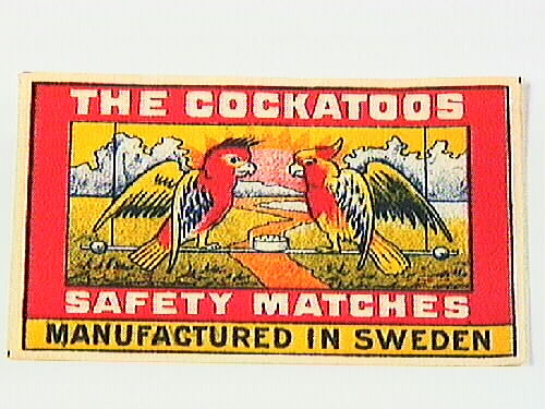 Bilden föreställer två fåglar på en vit stång. Färgen på fåglarna är rött, vitt, blått och gult. Marken är gul och grön. Blåvita moln och en gul himmel. Runt om bilden en röd bred ram med vit text: "THE COCKATOOS. SAFETY MATCHES". Längst ned svart text på gul bakgrund: "MANUFACTURED IN SWEDEN".