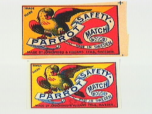Halva bilden har en gul bakgrund, den andra en röd, delad med en diagonal linje. Bilden föreställer en papegoja i färgerna rött, gult och grönt. I klorna håller fågeln en vit banderoll med blå text: "PARROT SAFETY MATCH, MADE IN SWEDEN". Längst ned svart text på röd bakgrund: " MADE BY JÖNKÖPINGS & VULCANS T.F.A.B. SWEDEN". Runt om en smal vit ram.