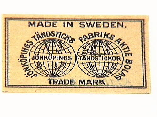 Bilden föreställer två jordglober. Svart text på gul bakgrund: "MADE IN SWEDEN, JÖNKÖPINGS TÄNDSTICKSFABRIKS AKTIEBOLAG, JÖNKÖPINGS TÄNDSTICKOR TRADE MARK".