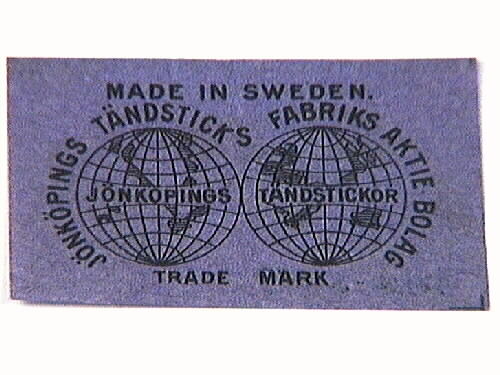 Bilden föreställer två jordglober. Svart text på blå bakgrund: "MADE IN SWEDEN, JÖNKÖPINGS TÄNDSTICKSFABRIKS AKTIEBOLAG. TRADE MARK".