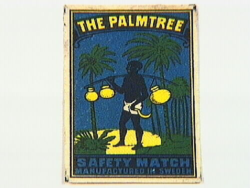 Bilden föreställer en inföding med vita byxor och en gul skära i handen. På axeln har han en stång, med tre gula krukor hängande. Marken är gul och grön, palmerna gröna, och blå bakgrund. Överst en svart banderoll med gul text: "THE PALMTREE". Längst ned blå text på svart baksida: "SAFETY MATCH MANUFACTURED IN SWEDEN".