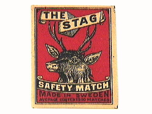 Bilden föreställer en hjorthane i svart och gult med röd bakgrund. Ovanför en gul banderoll med svart text: "THE STAG". Nedanför en svart banderoll med gul text: "SAFETY MATCH". Längst ned svart text på röd bakgrund: "MADE IN SWEDEN. AVERAGE CONTENTS 60 MATCHES". En gul smal ram runt om bilden.