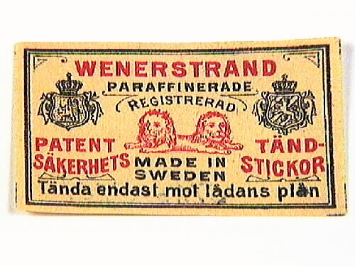 Etikett i färgerna rött, gult och svart. Bilden föreställer två lejon i mitten i rött och gult med gul bakgrund. Snett ovanför på båda sidor om lejonen, vapensköld i svart och gult på gul bakgrund. Röd och svart text på gul bakgrund: WENERSTRAND PARAFFINERADE REGISTRERAD. PATENT SÄKERHETS TÄNDSTICKOR. MADE IN SWEDEN. Tända endast mot lådans plan.