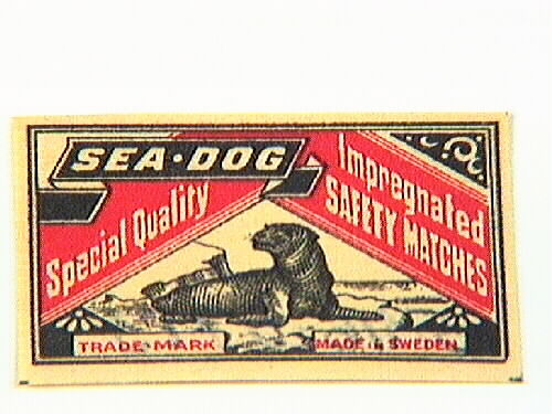 - Etikett i färgerna rött, gult och svart. Bilden föreställer en säl i svart och gult med gul bakgrund. Ovanför sälen, gul text på röd bakgrund: Special Quality. Impregnated. SAFETY MATCHES. Längst upp till vänster en svart banderoll med gul text: SEA DOG. Under bilden, röd text på gul bakgrund: TRADE MARK, MADE IN SWEDEN.