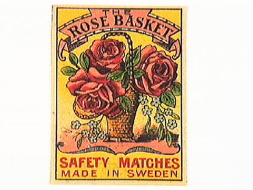 - Etikett i färgerna rött, gult, rosa, brunt, blått, grönt och svart. Bilden föreställer en korg med rosor. Rosorna i rosa och rött, gröna blad och andra blå blommor. Brun korg. Banderoll i rosa med svart text: THE ROSE BASKET. Gul bakgrund. Längst ned, röd text på gul bakgrund: SAFTEY MATCHES MADE IN SWEDEN