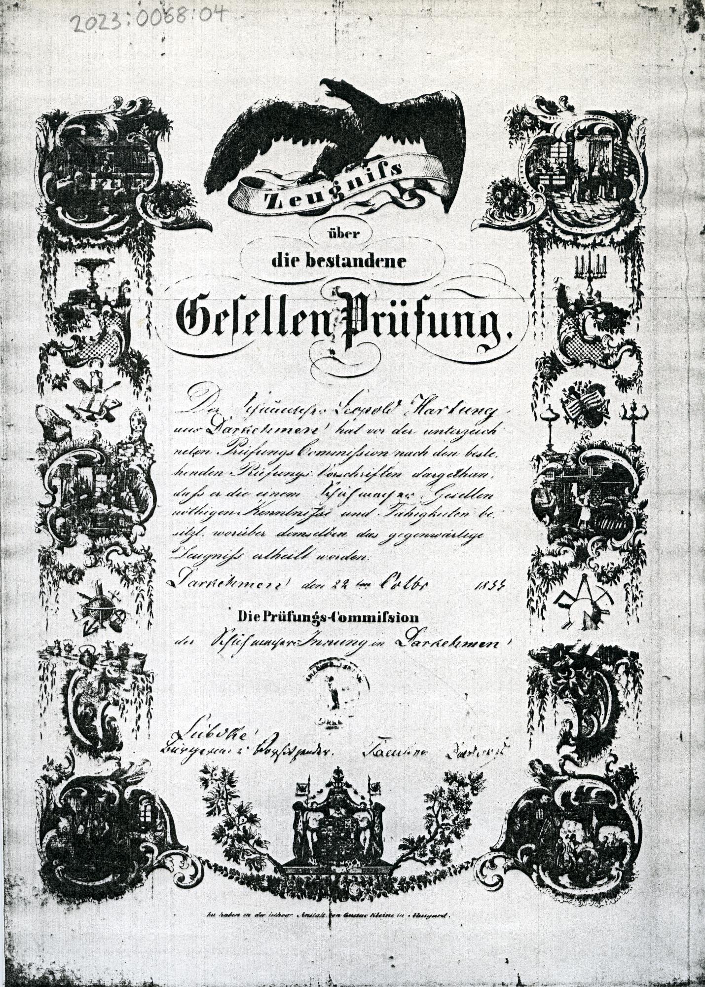 Kopia av gesällbrev inom skomakeri tilldelat Leopold Hartung 1855.