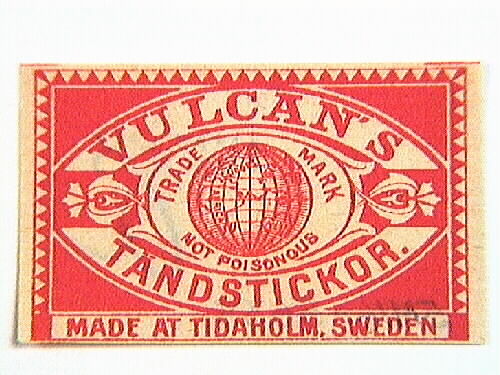 Bilden föreställer en jordglob, vit och röd. Utanför ett brett vitt band med röd text: "TRADE MARK NOT POISONOUS". Längst ut två breda bågformiga band med röd text på röd bakgrund: "VULCAN¿S TÄNDSTICKOR". Längst ned röd text på vit bakgrund: "MADE AT TIDAHOLM, SWEDEN".