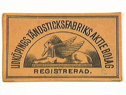 Bilden föreställer en sfinx i en halvcirkel i svart och gult. Ovanför cirkeln svart text skrivet i en bågform med gul bakgrund: "LIDKÖPINGS TÄNDSTICKSFABRIK AKTIEBOLAG". Under bilden svart text med gul bakgrund: "REGISTRERAD".