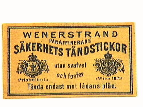 Text: "WERNERSTRAND PARAFFINERADE SÄKERHETSTÄNDSTICKOR utan svafvel och fosfor. Prisbelönta i Wien 1873. Tända endast mot lådans plån".