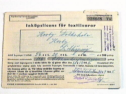 - Vitt papper med vidhäftade blå kuponger. Tryckt text på streckad linje ifyllt med blåpenna:LICENSKUPONGHÄFTE, Inköpslicens för textilvaror. Antal kuponger i häfte 56 st á 1,20 st á 50, .....st á 500 poäng, tillsammans motsvarande 156 Etthundrafemtiosex. Inköp mot kupongerna i detta häfte får ej göras efter den 31/12 1945 5. Omedelbart efter giltlighetstidens utgång skola icke använda kuponger, kvarsittande i häftet, insändas till Kristidsstyrelsen. Lös kupong gäller ej. Vid inköp avskiljes kupong av säljaren. Licens får ej överlåtas. Licensen gäller endast för i ansökan uppgivet ändamål. Såsom villkor för tilldelning av ransonerade varor åt näringsidkaren ställer sig till efterrättelse de föreskrifter angående rörelsen, som statens livsmedelskommission utfärdat eller kan komma att utfärda. STATENS LIVSMEDELSKOMMISSION. Formuär B 1874 - dec 1944. Stämplad med : "Norra Skaraborgs kristidsstyrelses kontrollbyrå", samt "Licensmott. skall senast 20/3 1946 till kristidsstyrelsen redovisa kuponger (licenser) motsv. värdet på denna licens. Licensen är utfärdad för Hovby Folkskola, Hovby, Lidköping. En karta med 31 blå kuponger och en med 8 gul-blå kuponger finns kvar.