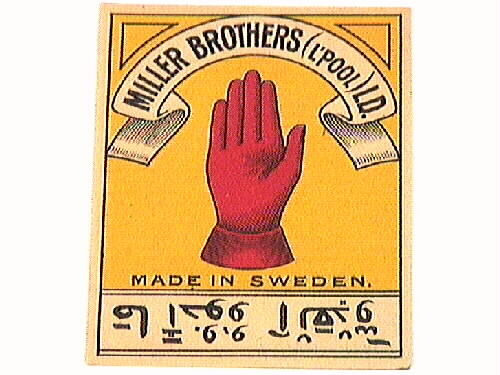 Tändsticksetikett med gult centralt parti, rött motiv, text i svart. På banderoll texten: MILLER BROTHERS (L¿POOL) LD. Därunder en röd hand med texten MADE IN SWEDEN. Därunder ett fält med troligen kinesisk text.
