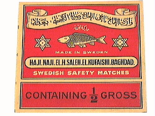 Tändsticksetiket. Röd bottenfärg med text och motiv i gult och svart. Överst en banderoll med arabisk text. Därunder en fisk med arbiskt ord över, en 6-uddig stjärna på vardera sidan och MADE IN SWEDEN står skrivet under. Inom svartkantad oval står med svart: HAJI. NAJI. EL.H. SALEH. EL. KUFAISHI. BAGHDAD. Därunder står: SWEDISH SAFETY MATCHES: CONTAINING 1/2 GROSS.