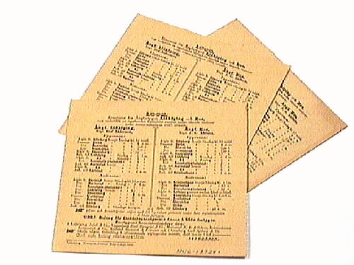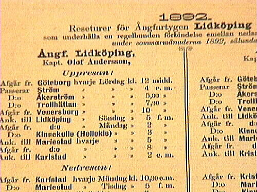Turlista. Tre stycken för reseturer med ångfartygen LIDKÖPING och EOS, sommaren 1892. Har gulnat med tiden.Givaren är dotterson till sjökapten Jacob Gideon Ahlberg (f 1844, d 1911) som var befälhavare på ångaren EOS I och II mellan 1867-1907. Vänermuseet en större samling rörande J G Ahlberg och hans liv.
