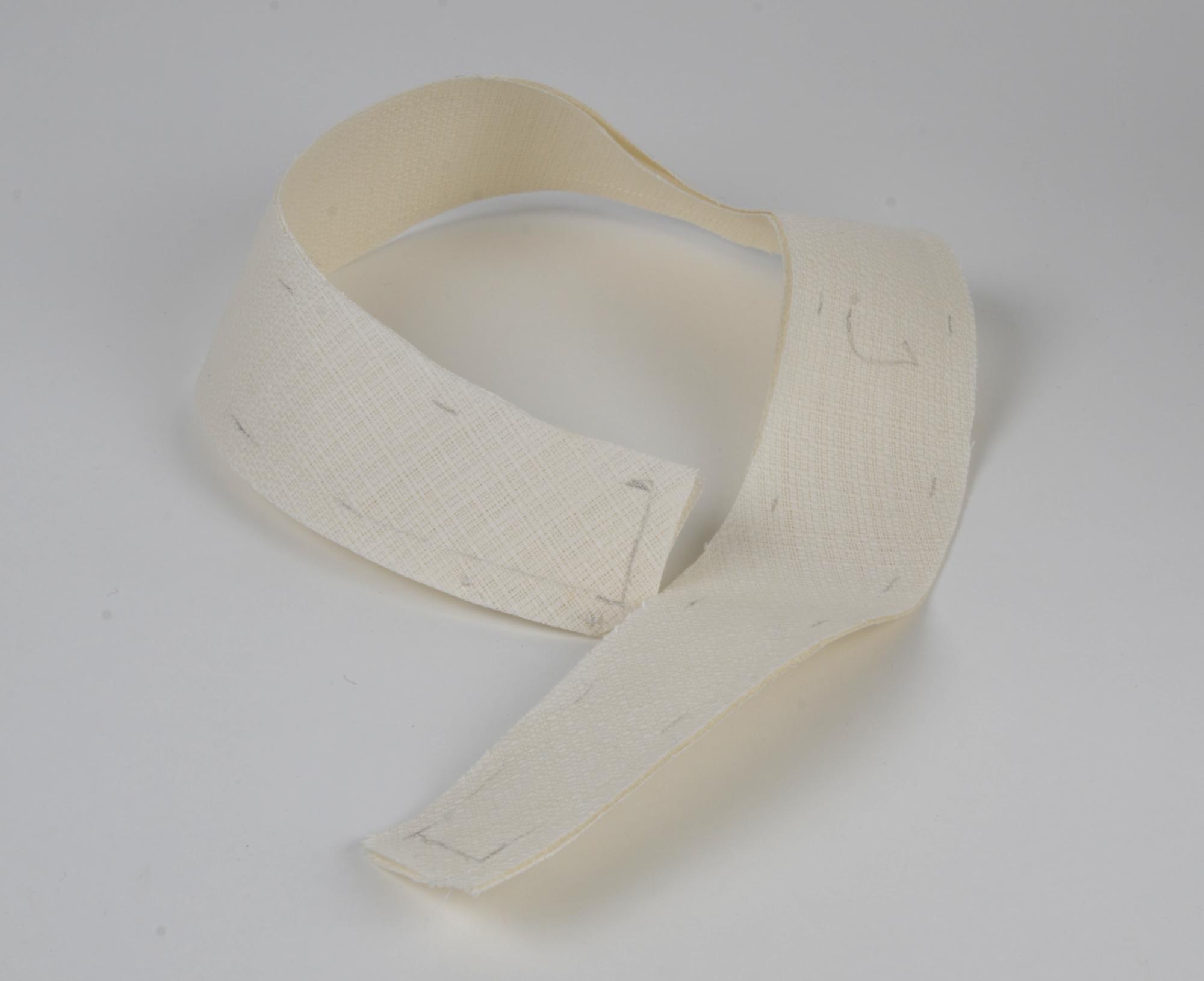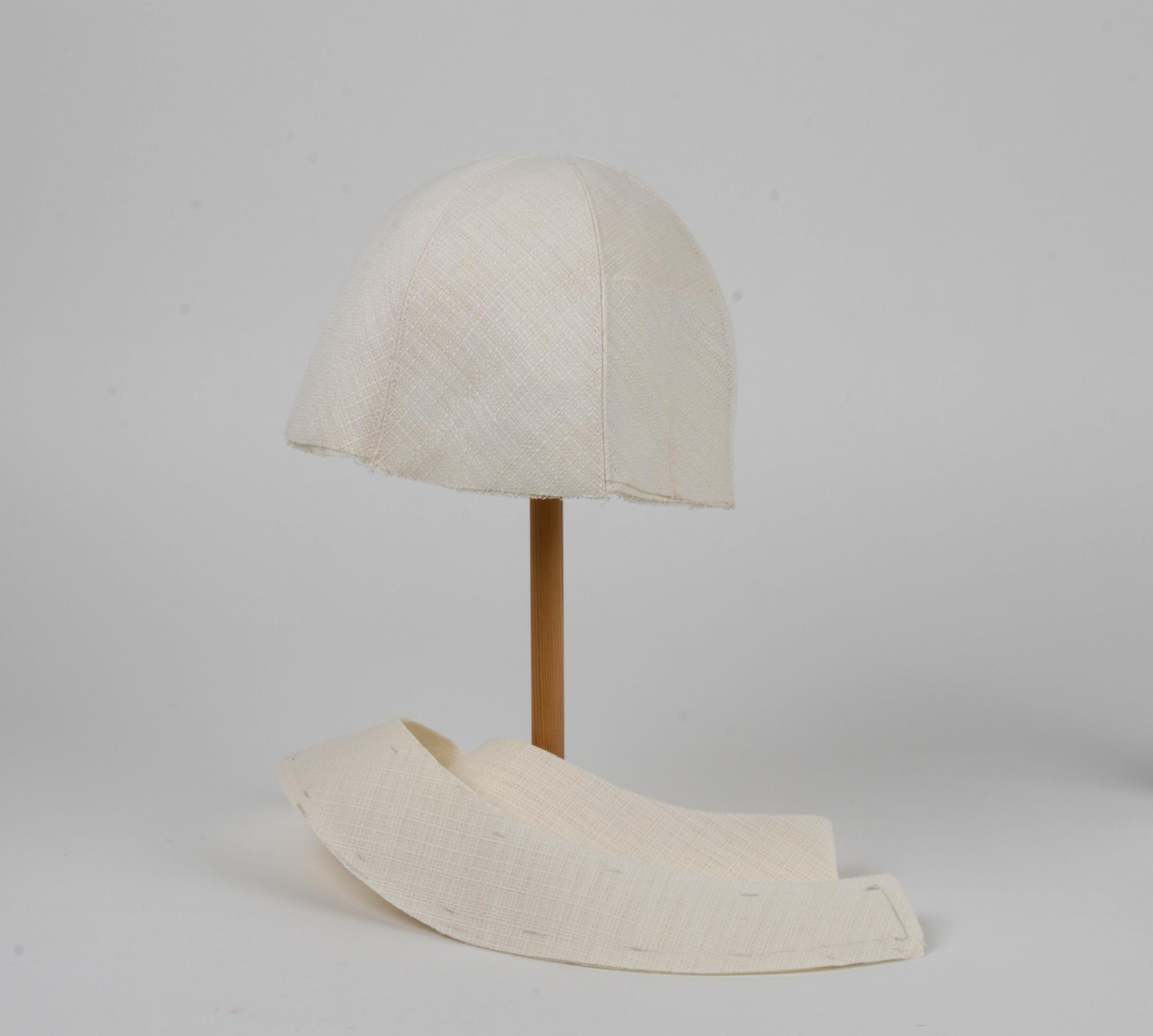 Damhatt, vit, påbörjad, i två delar. Den vita väven utgör basen, samt innanmätet i den färdiga hatten.