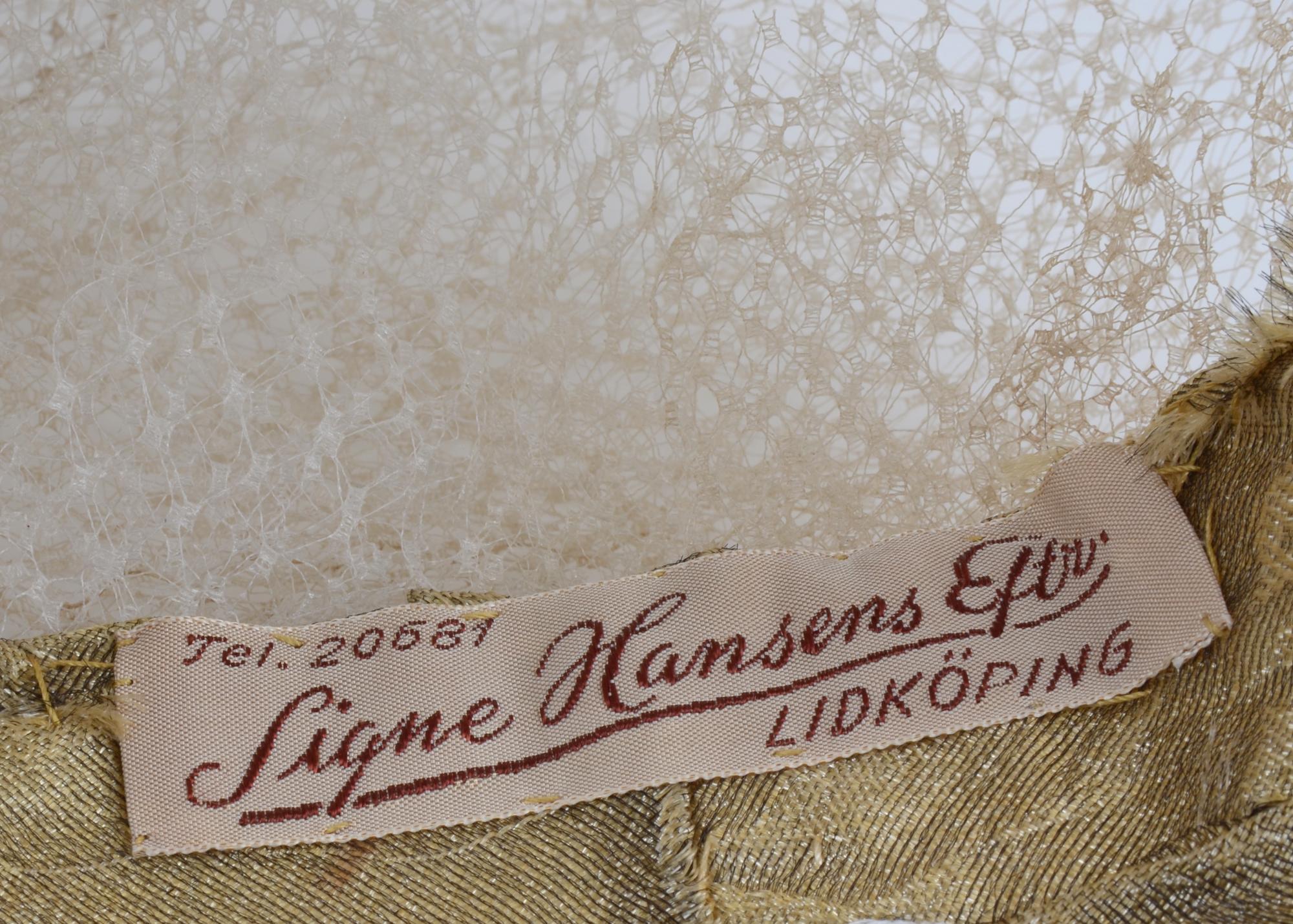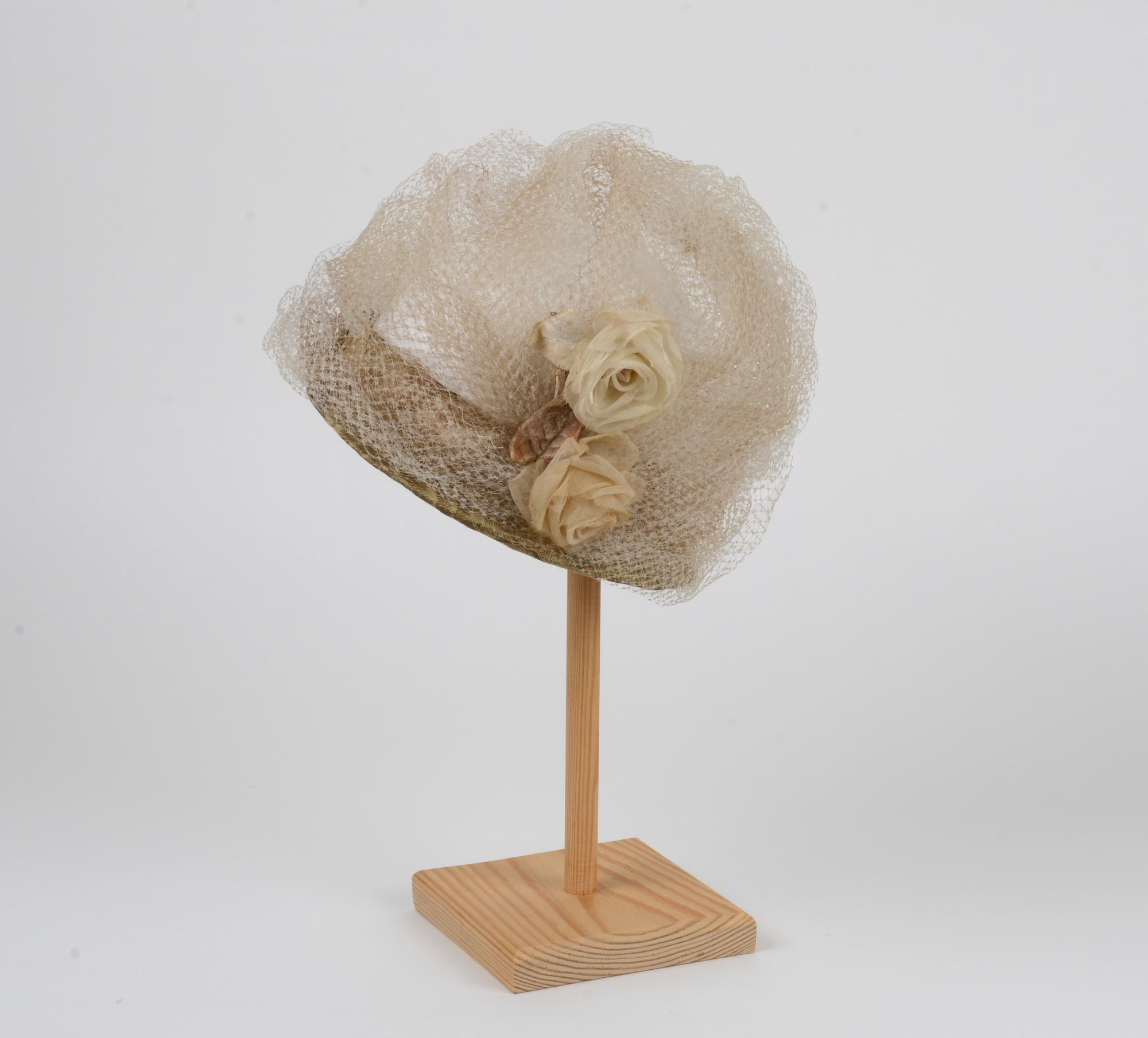 Brudhatt av ljus-biege flor med två vita rosor på sidan. Buren av tillverkaren själv, Rut Kühnel, på hennes bröllop. Rut var innehavare av modeaffären och ateljén Signe Hansens Efterträdare.