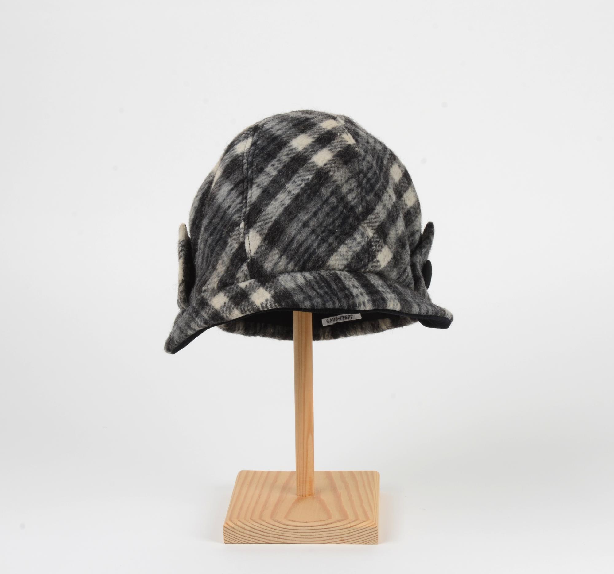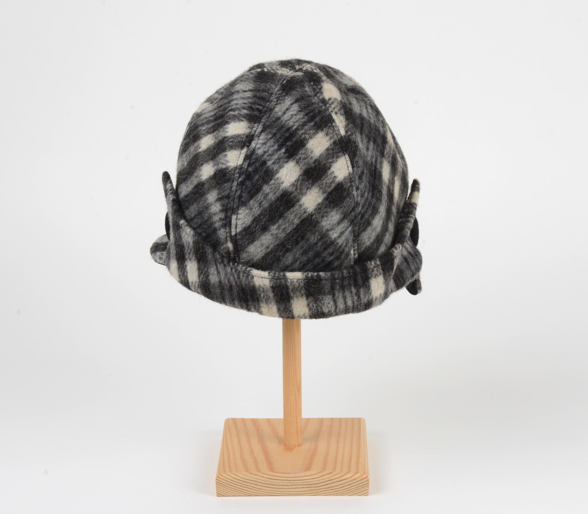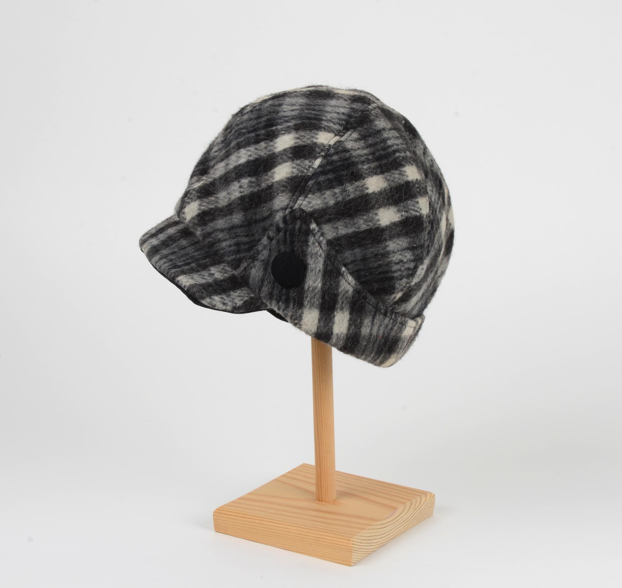 Keps, dammodell av ylle. På sidorna finns nedfällbara öronlappar, vilka kan fästas uppåt med hjälp av en svart knapp på vardera sida. Mönstret består av breda rutor i grå, svart och vit nyans. Cerises foder på insidan.
