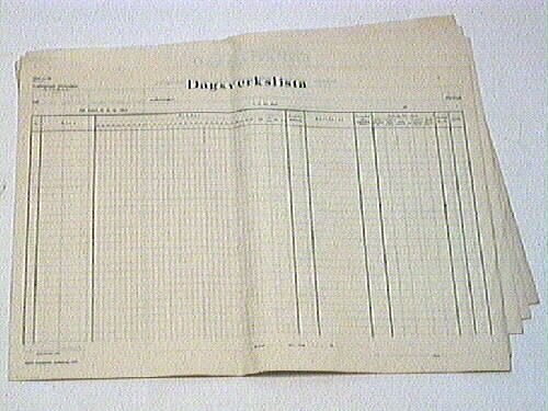 Sju stycken dagsverkslistor helt oanvända. Avsedda för de anställda vid Lidköpings järnvägar. Där fördes in namn, antal timmar per dag och hur mycket del blev i avlöning. Dessutom avdrag för skatt och förskott.