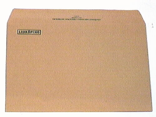 C4-format. I övre vänstra hörnet logotyp: "LIDKÖPING", inom ram. På fliken text: "LIDKÖPINGS MEKANISKA VERKSTADS AKTIEBOLAG", och adress. Brunt papper med grönt tryck. Höjd med flik.