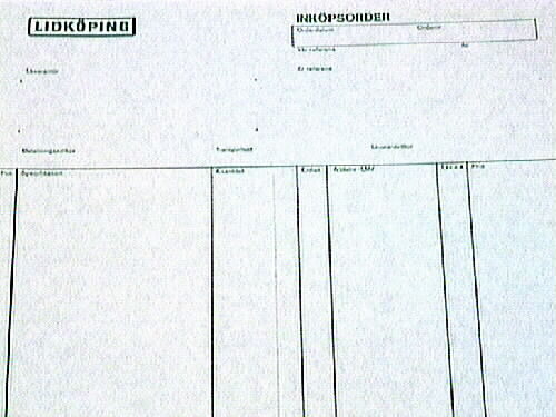 Användes vid varuhantering. Inköpsorder. Blankettset om vardera fyra blanketter med kalkerpapper. Perforerade för maskinmatning i kanterna. Lagren av blanketter är sammanpressade i kanterna. Ofärgat papper med grönt tryck. Upptill logotyp: "LIDKÖPING", inom ram, och ordet: "INKÖPSORDER".