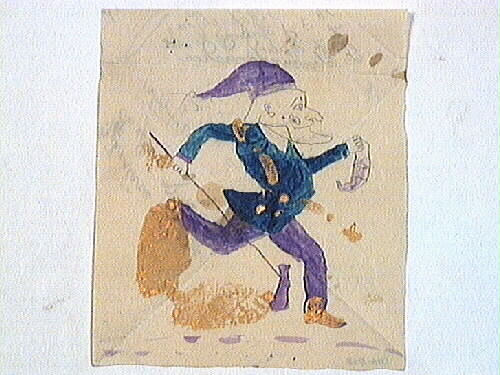 - Akverellteckning av en mansfigur klädd i lila byxor, blå jacka ioch lila mössa. I ena handen håller hanett smörjhorn och i den andra en raka. Över papperet är det färgfläckar i guld. På baksidan står det skrivet: Till Påsktrollet Anna Ström Påskafton Angeläget. Färgfläckar och klotter.