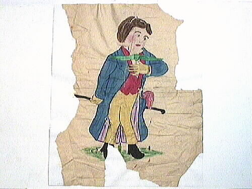 Akvarellteckning av en man klädd i gula byxor, svarta skor, blå rock med lila foder, röd väst, grön scarf och gula handskar. Han har brunt hår och bakom ryggen håller han en brun käpp. Teckningen var mycket trasig och är lagad med Japanpapper, 19830225.