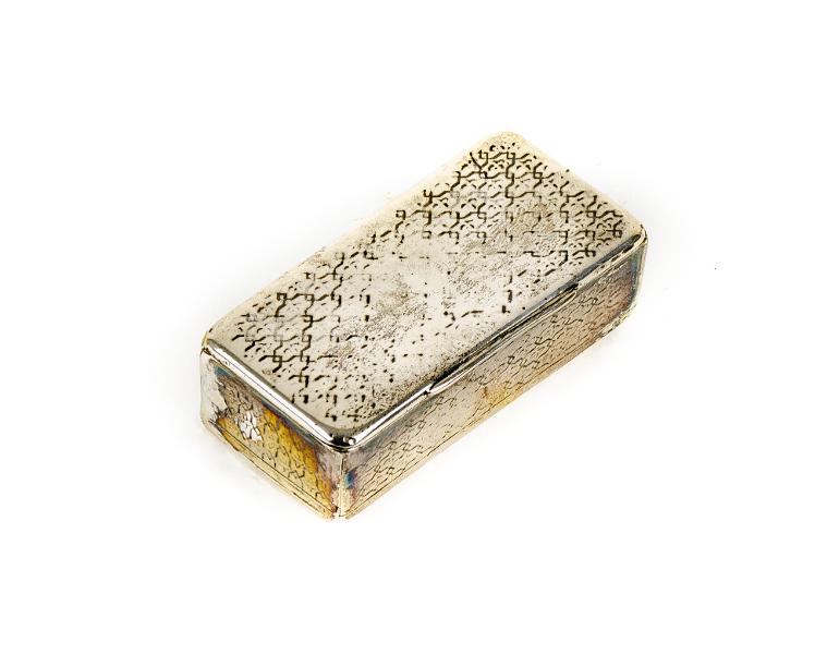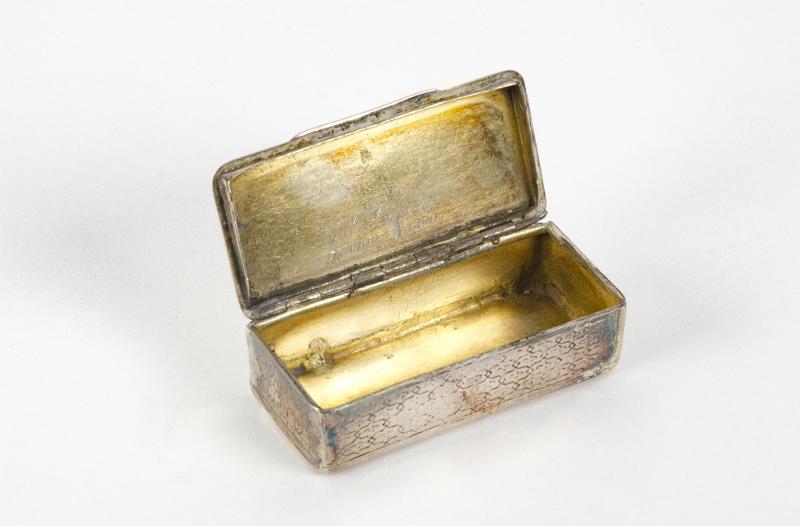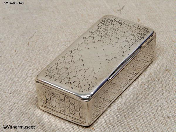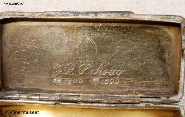 Rektangulär dosa med lock. De plana utsidorna är dekorerade med ytfyllande mönster. Locket är fäst vid dosan med genomgående sprint, som gångjärn. På lockets insida troligen tillverkarens stämpel, svårläst, eventuellt fransk tillverkning bl a står "BREVET DINVET". Därunder graverat J:P: Schoug *1802 d (kors) 1890. Dosans inre är förgyllt.