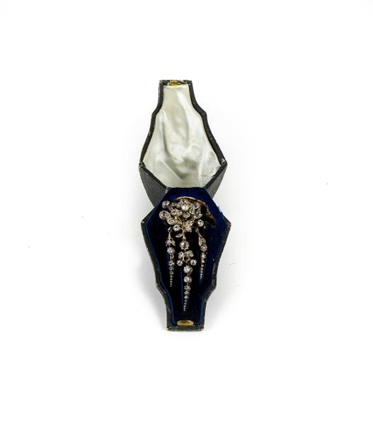 Broschen ligger på blått sammetspodium med försänkning i mitten.Längd: 97 mm, bredd: 60 mm, Höjd: 46 mm.