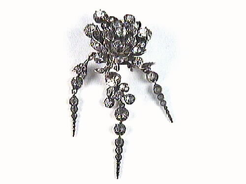 Brosch i form av blomma med blad, under hänger tre tappar. 54 stycken briljantslipade vita safirer av olika storlek med avdäkt (överdäckad) och rak fattning i silver. Fästes med enkel nål i hake.