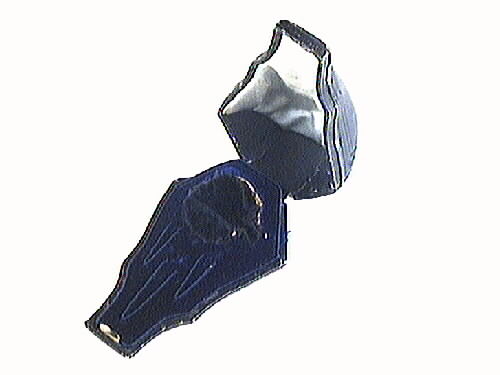 Etui avpassat för broschen. Halvt päronformat, utsidan av svart läderliknande material. Insidans lock klätt med ljus siden.